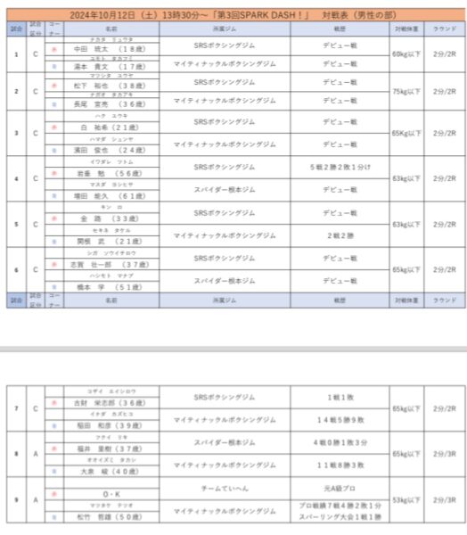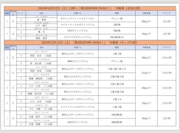 今回、第一部(11時開始)女性2試合、新たにキッズ5試合、第二部(13時30分開始)男性9試合行われます🥊