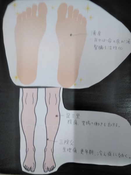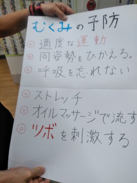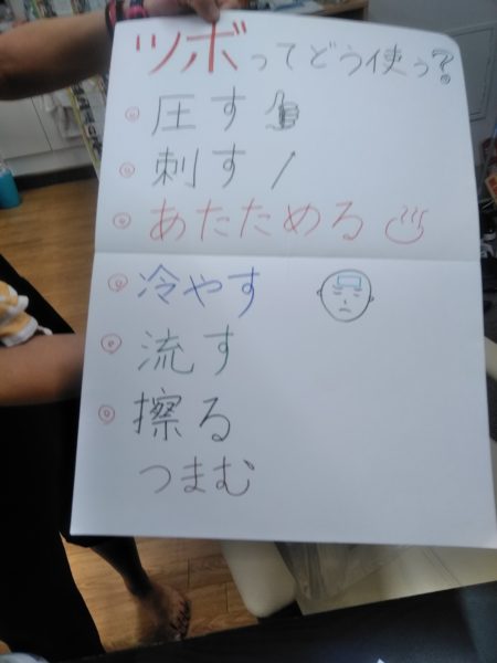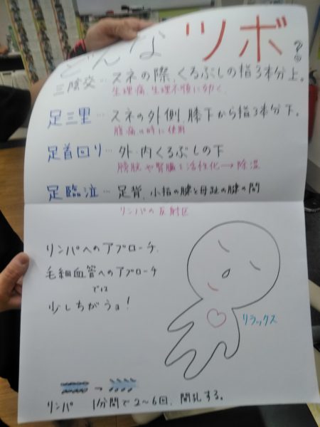 話すより図のほうがわかりやすいと、紙芝居的な?教材作ってきてくれて、むくみはなぜ起きるか、ツボとは?など最初はレクチャー